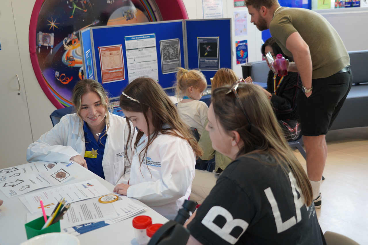 We welcomed patients, families, and staff from across the hospital for an afternoon of interactive activities run by our research, pharmacy, Children and Young People’s Health Resource (D-CYPHR) and lab colleagues such as bracelet making, chocolate and skittle experiments, and colouring in. GOSH Arts treated us to a musical performance and we were visited by therapy dogs Bailey and Dr Ted.